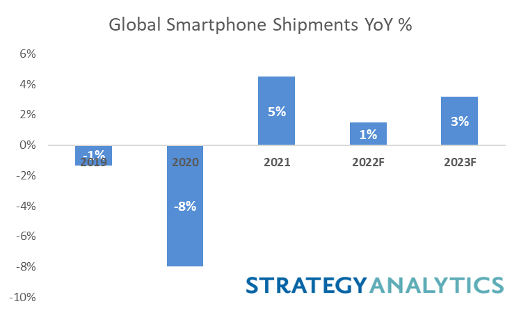 随着乌克兰和俄罗斯之间的冲突日益加剧,Strategy Analytics也下调了2022年和2023年全球智能手机出货量的预测值。