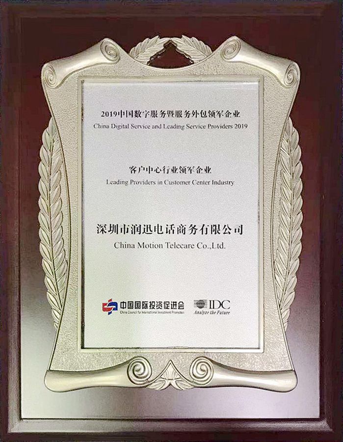 2019年9月26日,深圳市润迅电话商务有限公司(以下简称“润迅”)受邀出席在杭州举办的“第十届中国国际服务外包交易博览会”,并凭借深厚的行业积累以及丰富的服务外包经验,获得由会议颁发的“客户中心行业领军企业奖”。润迅也将以业界的认可为动力,把握客户中心行业的数字化发展机遇,推动客户中心行业价值链的跃升。