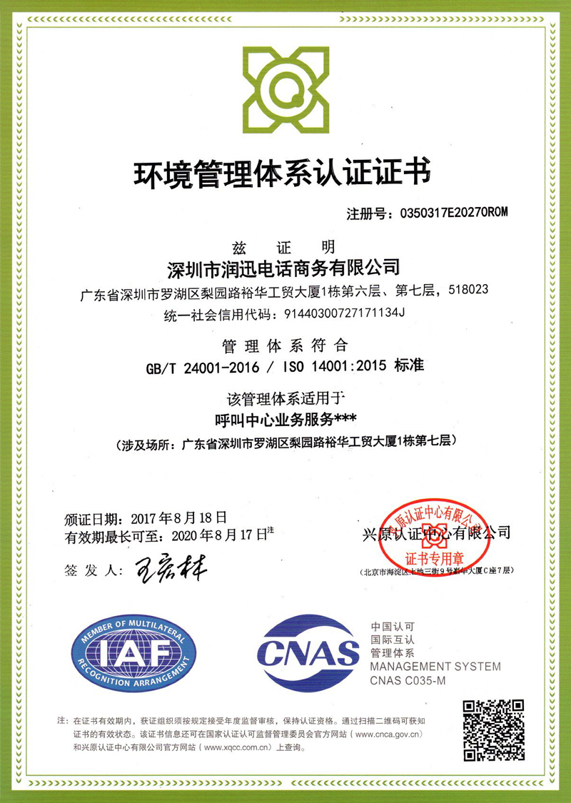 日前,深圳市润迅电话商务有限公司获得兴原认证中心有限公司颁发的环境管理体系认证证书,成为国内为数不多的获得环境管理体系(ISO14001:2015)认证标准的外包服务企业之一,将为员工及客户提供更具安全保障的工作环境。