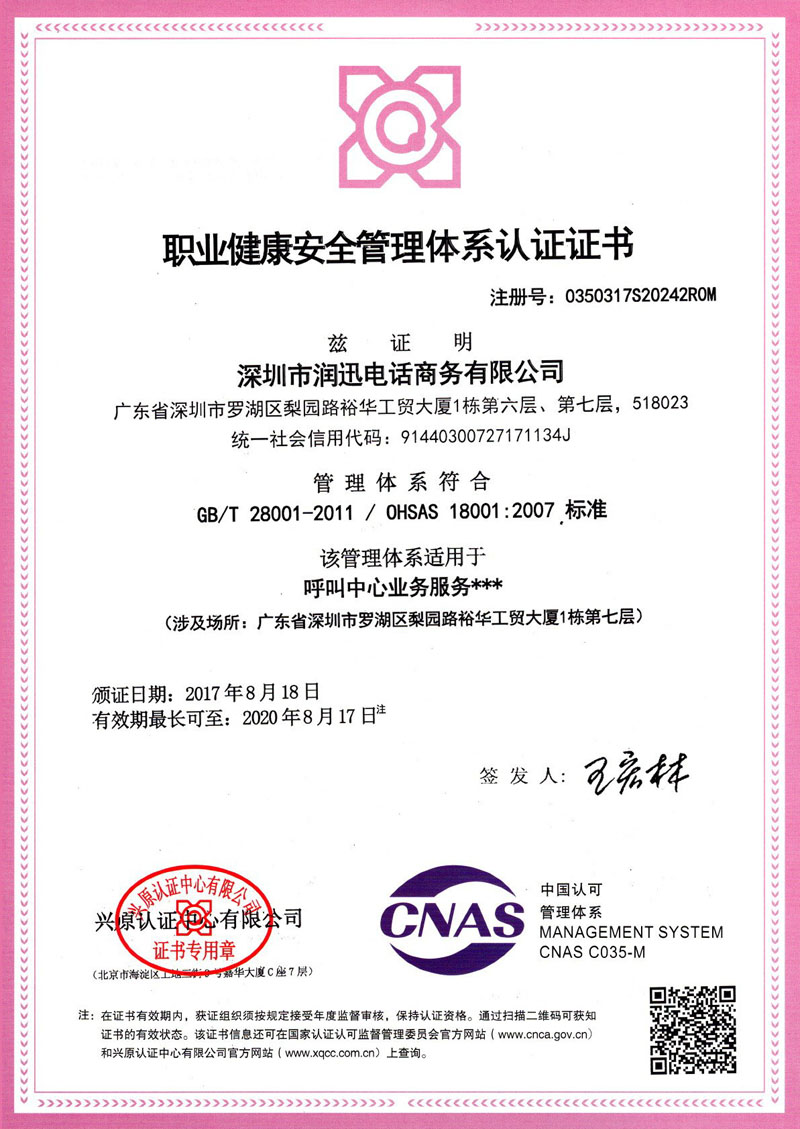 日前,深圳市润迅电话商务有限公司获得兴原认证中心有限公司颁发的职业健康安全管理体系认证证书,成为国内为数不多的获得职业健康安全管理体系(OHSAS18001:2007)认证标准的外包服务企业之一,将为员工及客户提供更健全的职业健康保障服务。