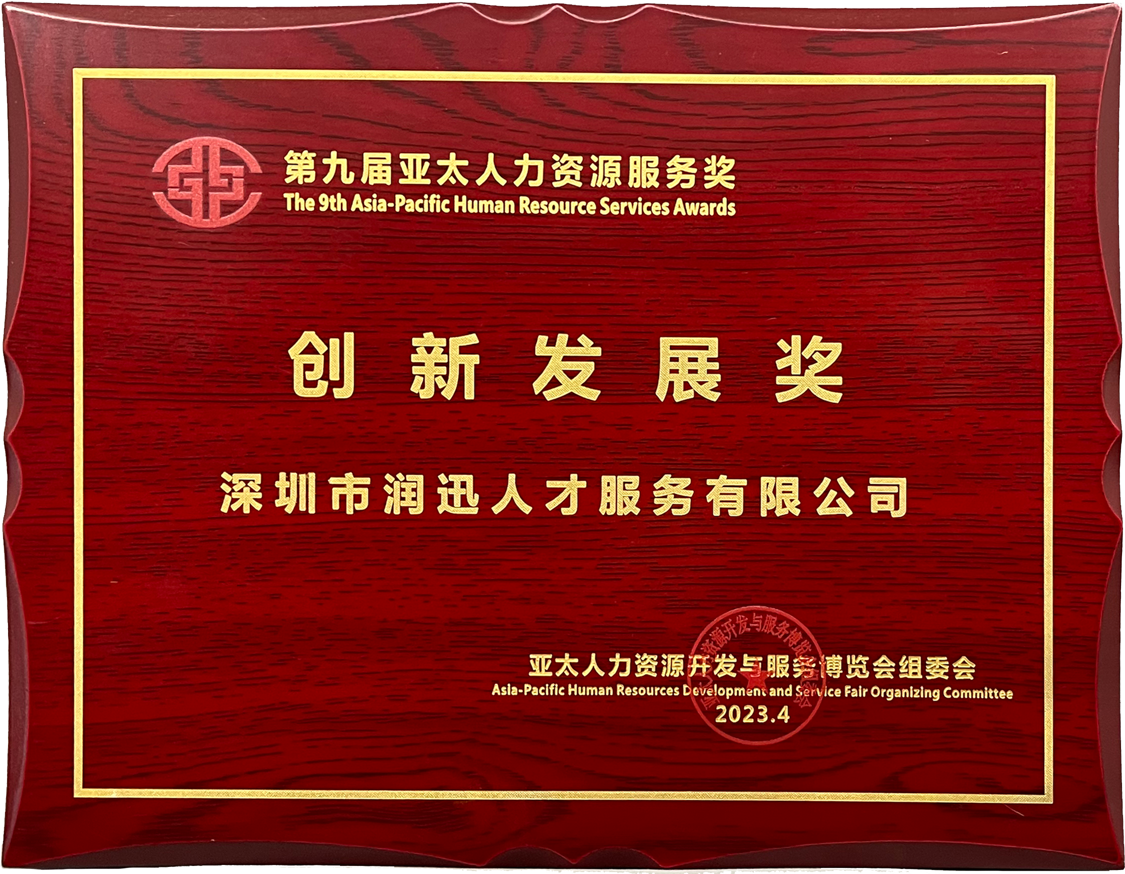 本次大会经国务院批准,由科技部(国家外专局)和深圳市政府举办,特邀国内人力资源服务行业专家以及同仁,以“‘中国式’人力资源服务:路径、产品、模式与技术”为主题,共同探讨新时代人力资源服务业的“中国式”发展模式和道路。为表彰行业优秀机构和突出贡献人才,为行业发展提供典范指标,以推动人力资源服务业的高质量发展,大会同期举办了“第九届亚太人力资源服务奖”颁奖仪式。润迅人才凭借敏锐的行业洞察、优质的专业服务等获得了组委会及评审专家的一致认可,获评为第九届亚太人力资源服务“创新发展奖”。