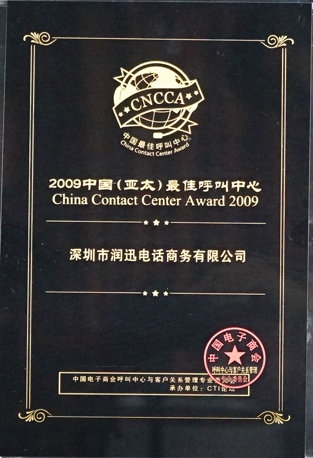 在由国家级行业协会中国电子商会呼叫中心及客户关系管理专业委员会(CNCCA)牵头,国家工业和信息化部支持,CTI论坛作为承办机构提供指导的第五届“中国(亚太)最佳呼叫中心大奖”的评选活动中,深圳市润迅电话商务有限公司凭借优质服务荣获“2009中国(亚太)最佳呼叫中心”。